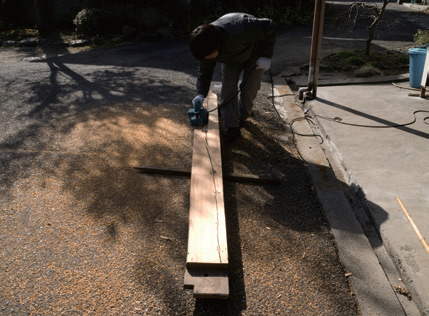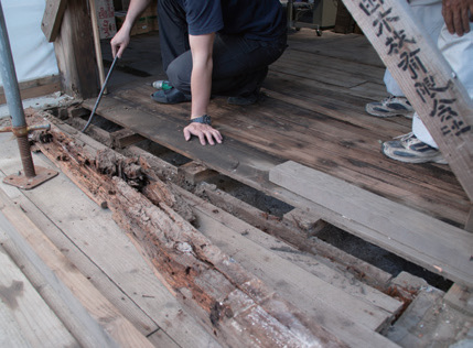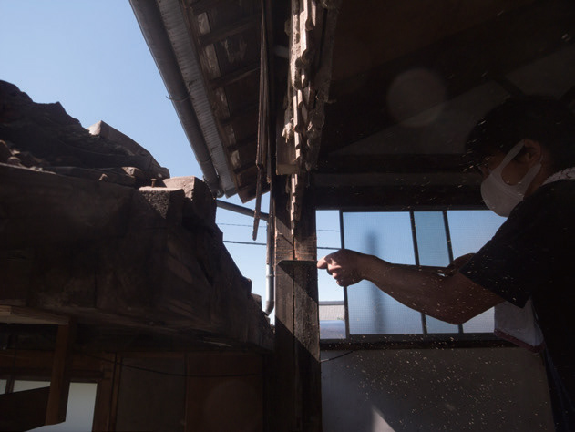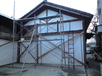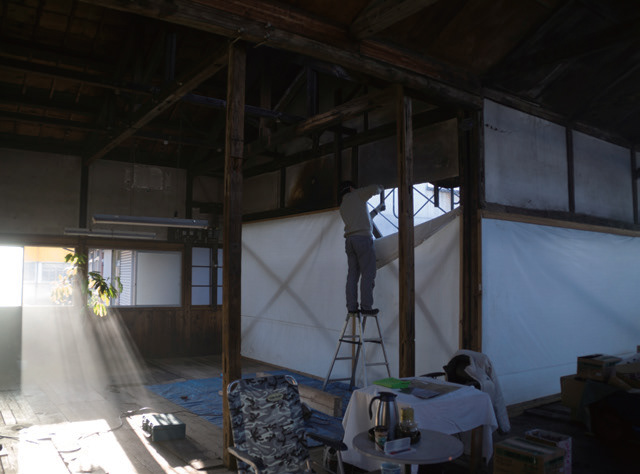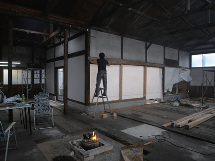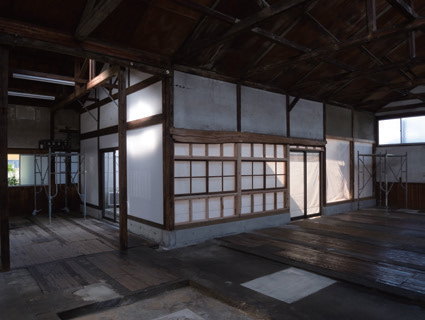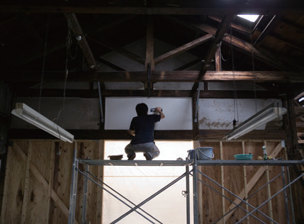 管捲き場と整経場だった場所との境、織り場と整経場だった場所との境にそれぞれ壁をつくる。元々非常に少ない柱と、壁が上半分のみだったため、その下に基礎を打ち、土台をいれ柱を立て、既存の柱や壁を支えて接続させる。工場稼働時は生産性重視のため、あるべき壁が無かった状態。織り場の壁の窓には整経場に使われていた木枠の硝子障子を使う。壁を移動させるイメージ。建物はかつての元の状態に戻しつつ、それでは不足な部分など必要な部分は改善するように考えていく。