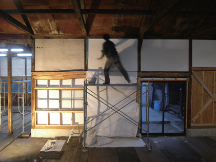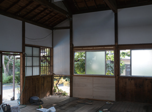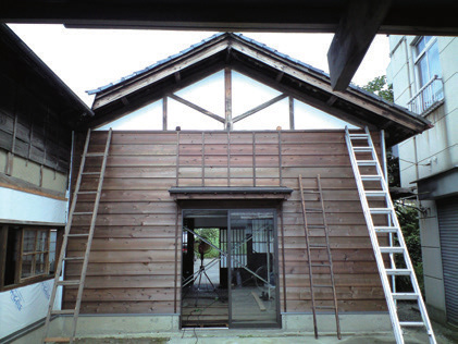 引き続き壁をつくる。整経場跡と織り場の境の下部を土壁にし、外壁には庇を取り付ける。管捲き場との境の外壁に下見張り。他、壊れている土壁を外してつくり直す等して修繕。その後、管捲き場の床の木の床を上げ、古く油が染みて脆くなっている既存のコンクリート床をはつる。床下の土を整理、砕石を叩き込む等して新しくコンクリートを打設、土間にする。また線路側の織り場の端の柱の列に基礎を入れるため、その準備。しっかりふれどめをしておく。