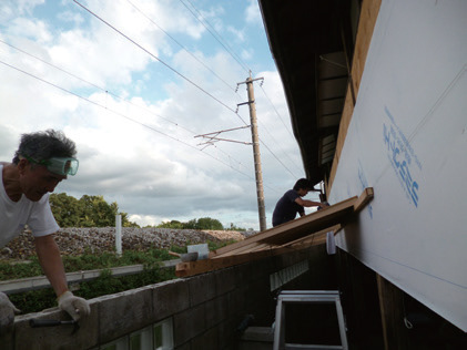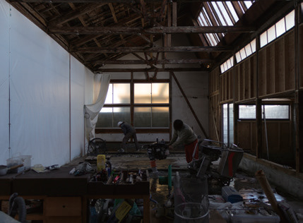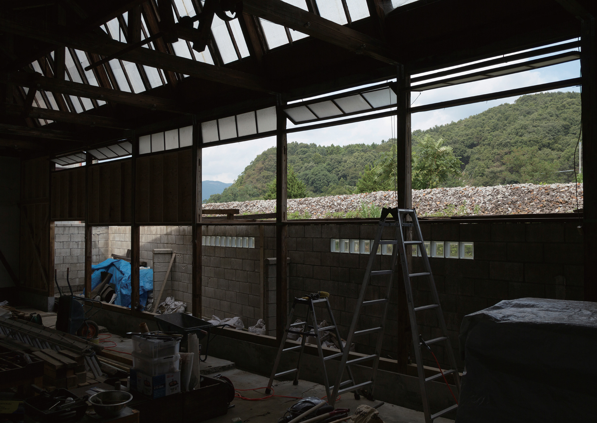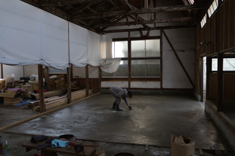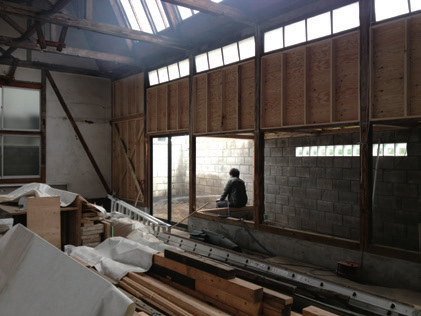 天井のベニヤは傷んで剥がれかけた場所もあり、線路側の棟の天井を剥がす。大量の土や砂が落ちる。線路側の壁は昭和の水害や雨漏りで土壁がだいぶ傷んでいるため、外して板の壁にする。その作業の間、壁を外すと向こうの山がよく見える。この時だけの景色。改めて下屋を架け、ブロック壁の三角の部分と線路側の鋸屋根の床をコンクリートの土間にするため準備する。年末、数名で土間を打つ。生コン車からネコ車で運び入れる。鏝で押さえていく。冬場のためなかなか水が引かず夜中までかかる。